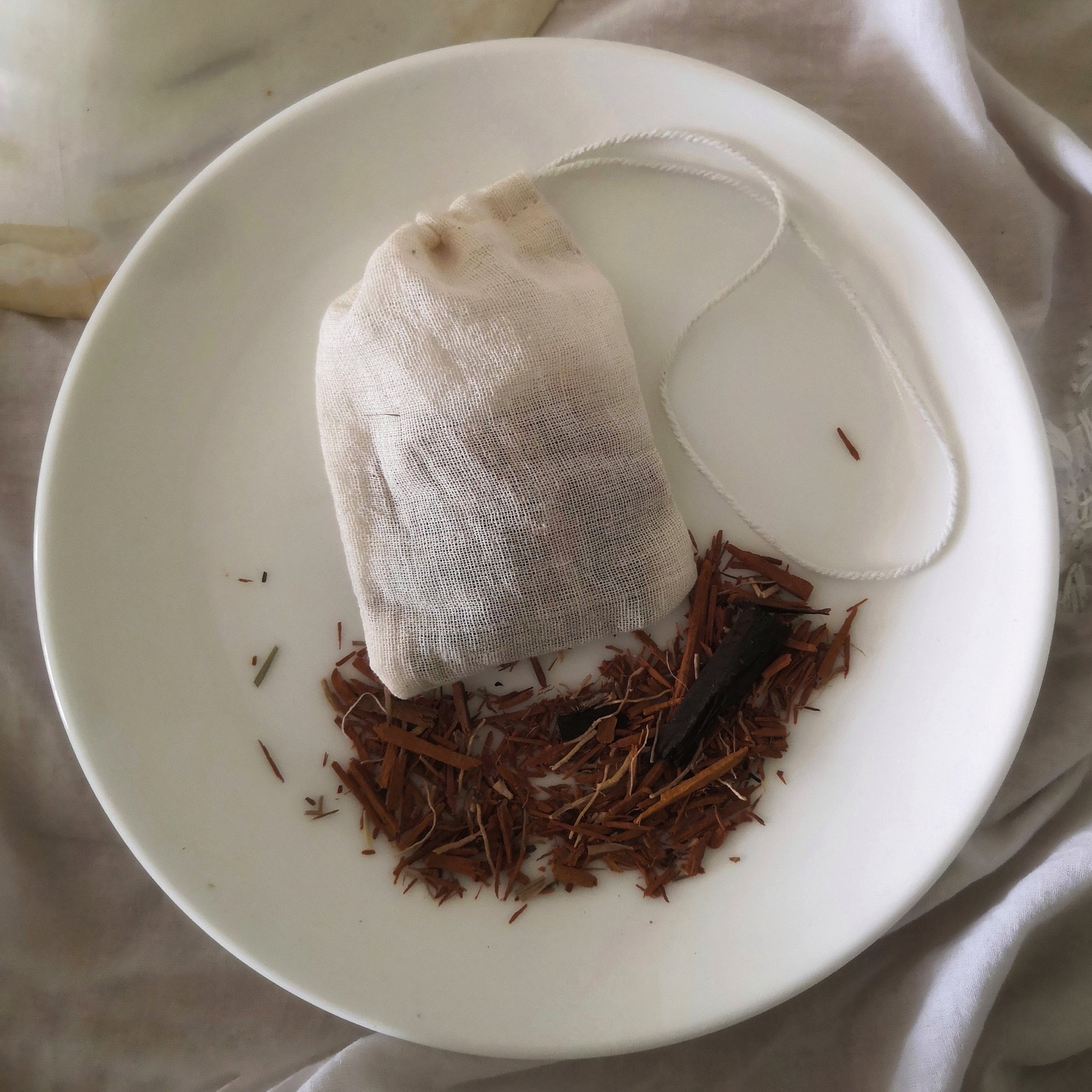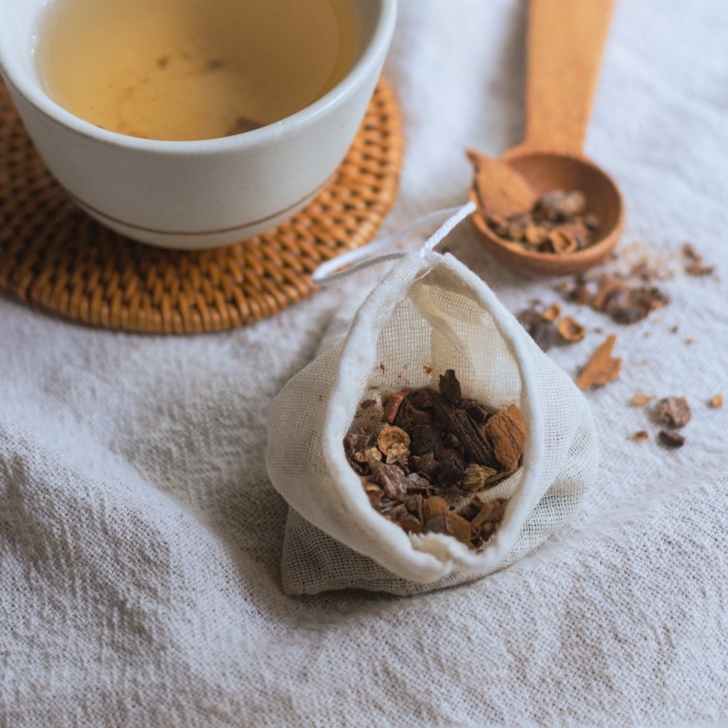 These tea bags are made from pure unbleached and non dyed cotton. The starched cloth is sturdy enough to be reused multiple times, and easily allows the flavour compounds to be released without absorbing any excess ingredients.