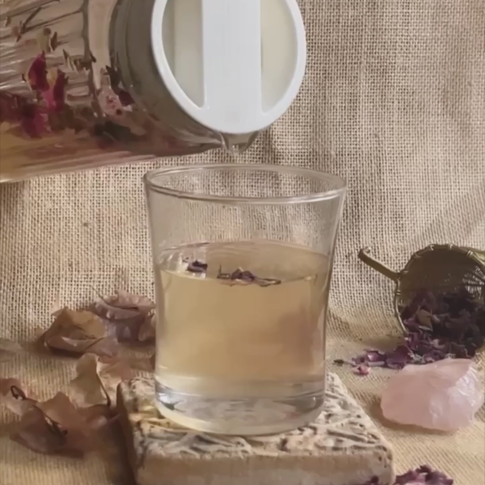 Comes with a Rose Quartz crystal inside the lid which continuously recharges the Elixir.
