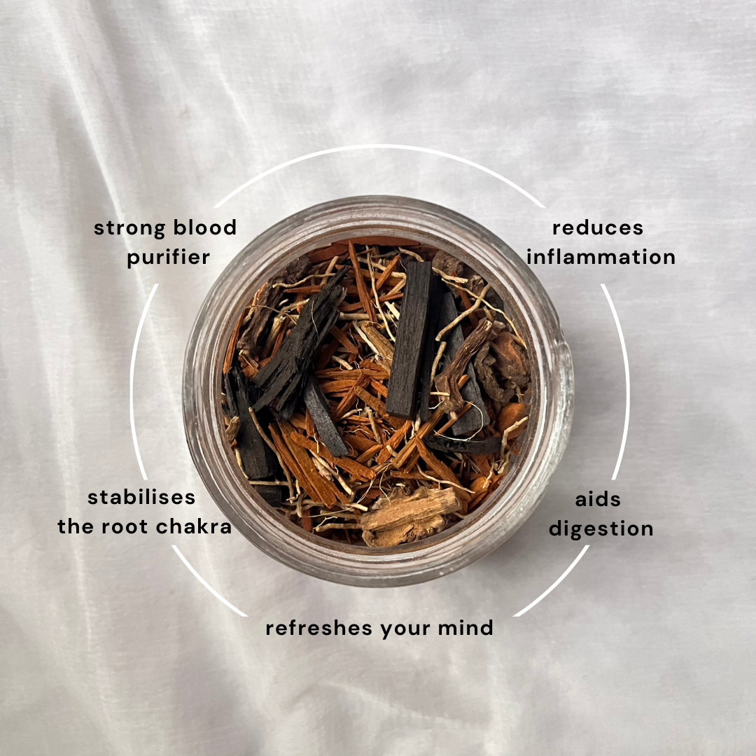 This herbal blend stabilises the root chakra (Muladhara) and benefits all the internal organs of the body. It’s a strong blood purifier, reduces inflammation, aids digestion and alleviates stress. You are drinking a piece of Earth with notes of dried wood, tree barks and roots.